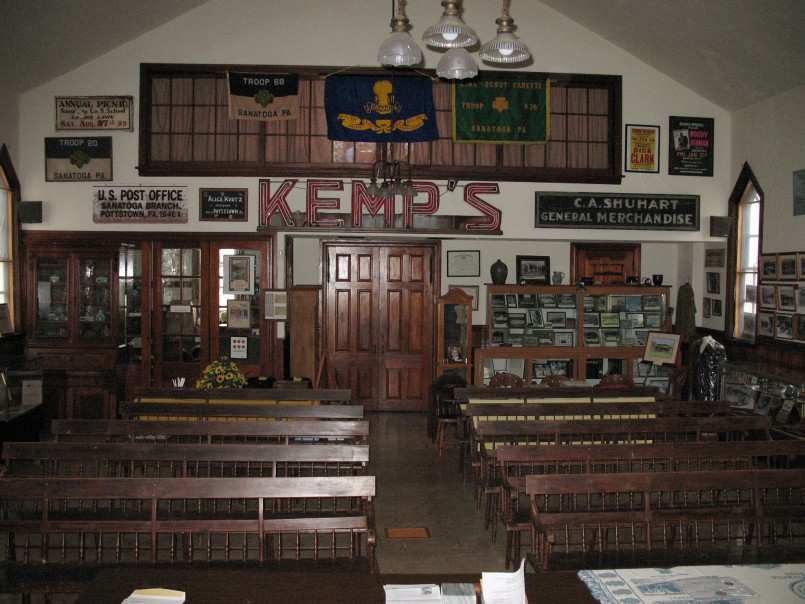 There are signs from some of the landmarks in the area like Kemp’s store, and Shuhart’s before them, and Pleasantview Farm (the Saylor farmstead). There are a lot of class photos both from the different schools, as well as from the Sunday School itself. We have the original bible from the chapel in a display case. We have old sleigh bells from the Kurtz farm on display. There are pictures of some of the old farmsteads in the area, and some interesting shots of the harvesting of the ice at Pruss Hill Dam. We have photos and memorabilia from the 1976 Bicentennial Wagon Train encampment in Saylor’s field displayed in a cabinet built by Elmer Saylor. We also have some articles of clothing, such as a trolley conductor’s uniform and an old fireman’s uniform.